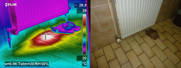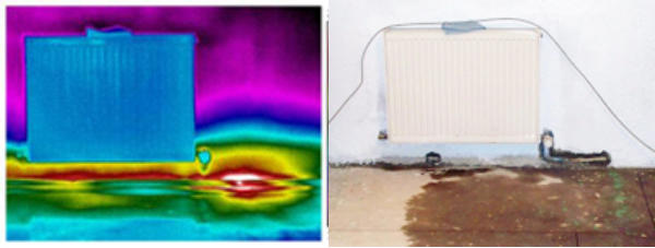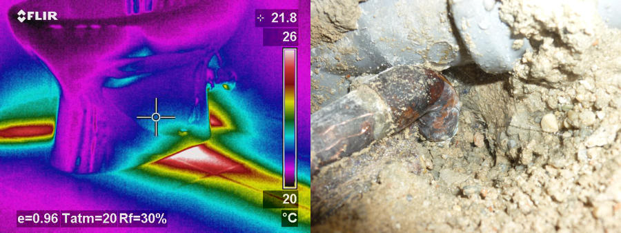 Leckortung mit kombinierten Messgeräten wie Thermografiekamera und elektroakustischen Ortungsgerät. Erkennbarer Wasseraustritt am Rohrbruch.