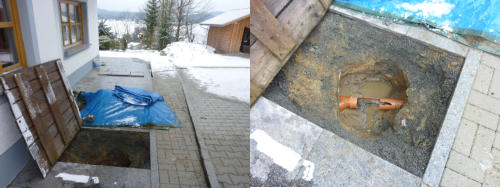 Leckortung mit elektroakustischen Ortungsgerät und punktuelle Öffnung der Leckage. Erkennbarer Wasseraustritt am Rohrbruch.